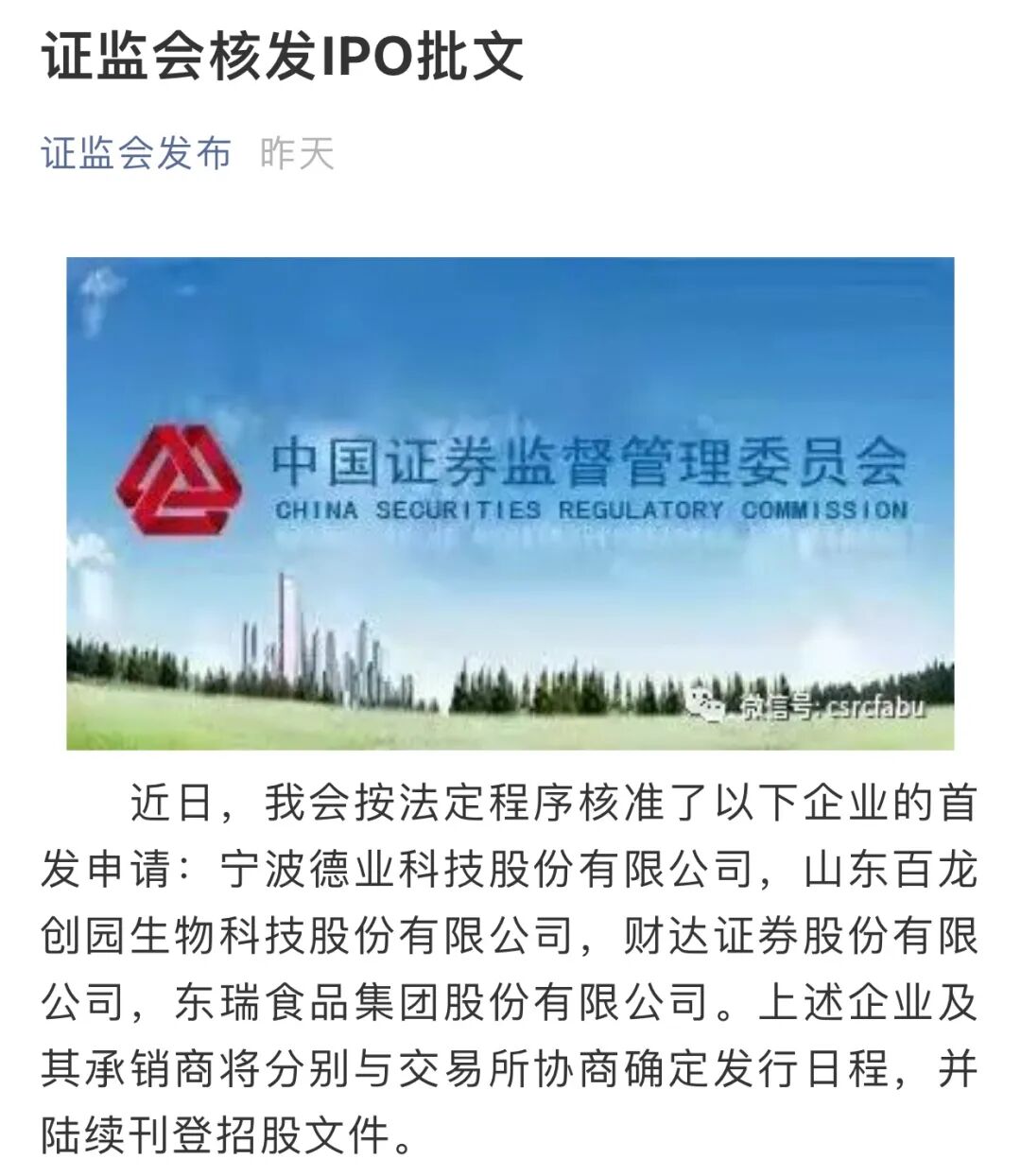 证监会官微3月26日晚间披露,于近日核准了4家企业的首发申请,分别为宁波德业科技股份有限公司,山东百龙创园生物科技股份有限公司,财达证券股份有限公司,东瑞食品集团股份有限公司。上述企业及其承销商将分别与交易所协商确定发行日程,并陆续刊登招股文件。