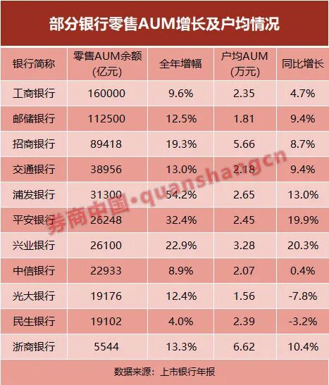 从增长情况来看,去年招行、工行、邮储银行、浦发银行零售AUM绝对增量相对靠前,均在万亿以上;浦发、平安、兴业3家股份行增幅居前三,分别为54%、32%和23%。
