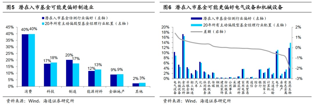 从大类行业来看,潜在入市基金相对全市场的主动偏股型基金会更加偏好制造业(建筑建材、建筑装饰、电气设备、汽车、机械设备),潜在入市基金/全体主动偏股型基金在制造业的配置比例分别为20%/17%、科技股为17%/18%、消费股为40%/40%、能源材料业(采掘、化工、钢铁、有色、交运、公用)为12%/13%、大金融为9%/9%、其他为2%/3%。