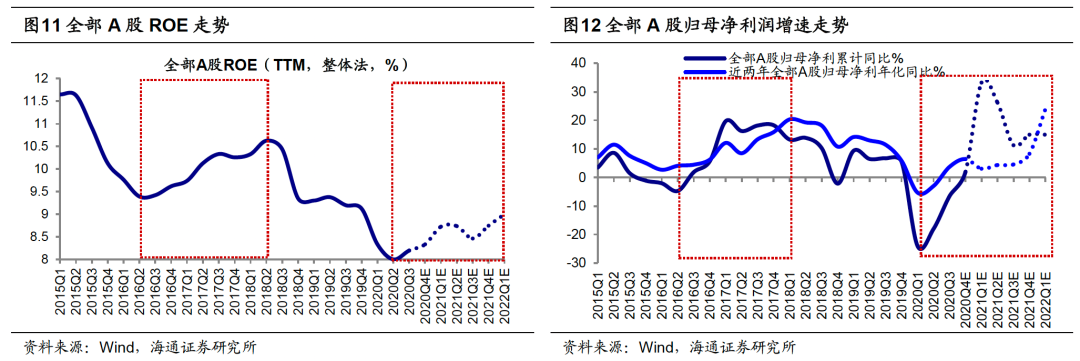 今年类似强版的2010年,当前重视机会。如前所述,我们认为未来一段时间内资和外资均将继续流入A股,股市微观资金面较充裕。前期多篇报告分析过,今年A股的背景是基本面回升的正能量大于宏观流动性略紧的负能量,19年1月初开始的牛市继续,经历218以来的调整,目前的重点应该是寻找机会。刚公布的Q1 GDP同比增速为18.3%,有投资者担忧这就是全年经济的高点了,未来经济就一路向下。我们认为Q1增速高主要是基数效应,如果以19年为基期看两年年化复合增速,则Q1增速为5%,Q2-Q4以Wind一致预期计算的单季度两年年化增速分别是5.72%/5.70%/5.75%。与股市更相关的还是要看微观的企业盈利。从企业盈利上看,本轮盈利周期是第六轮,全部A股归母净利累计同比于20Q1见底后回升,ROE于20Q2低点开始回升,盈利周期上行的动力源自补库存周期和宏观政策见效,借鉴历史企业利润上行周期一般持续6-7个季度,依此推断我们预计这次A股盈利回升持续到今年底,ROE高点为21年底22年初。从净利润增速看,由于20Q1净利润基数较低,全部A股21Q1净利润增速将是阶段性高点,但是拉长全年看,A股盈利仍有望保持高增长,全年净利同比为15%~20%。如果要剔除归母净利同比基数影响,按照近两年净利润年化增速推算,近两年净利润年化增速高点出现在2022年初。