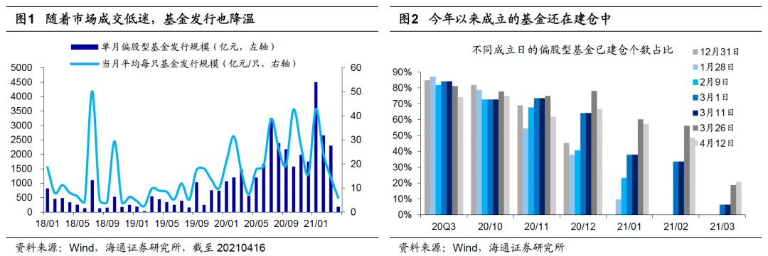 潜在入市基金尚有1.1万亿元。在一月基金发行大热时我们曾在报告《新基金规模和偏好分析-20210117》中做过入市基金规模的测算,我们将基金分成两类,一类是已经成立但是还没建仓的基金,另一类是已经拿到批文但是还没成立的基金。本次我们依旧按照当时的口径进行测算:①已成立基金中我们按照市场大跌大涨日基金净值是否出现明显波动来判断基金是否已建仓,以4月12日为例,当日市场七成个股下跌且茅指数大跌2.7%,对应今年1月成立的新基金中有60%的基金出现了大幅的净值波动,2、3月成立的基金中分别有50%和20%的基金出现了净值波动。将净值未出现波动的基金的规模加总,我们算得目前尚有约5000亿新基金尚未建仓。②未成立基金方面,我们测算目前有400多只基金已经拿到了批文但是尚未发行基金,按照今年3月每只发行规模15亿推算,这部分基金的规模大约是6000亿。因此整体上看,未来潜在入市基金的规模尚有1.1万亿元。