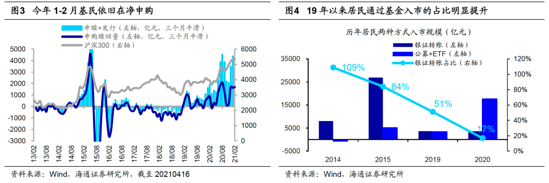 有投资者担忧春节后的大跌会不会带来基金投资者的赎回?目前基金业协会已经公布2月的基金存量数据,叠加万得的基金发行数据,我们能够反推出今年1、2月基民均是净申购的,净申购规模分别为600亿元和900亿元。那未来基金赎回的压力会不会很大,我们认为也不会。在前期周报《股市走向低波动——借鉴过去房市和美股-20210405》中我们指出,随着产业结构和人口结构的调整,居民资产配置的力量正从房市转向股市,过去两年居民资金大幅入市意味着这一趋势的开始。和过去的牛市相比,本轮居民入市主要通过基金,2019-20年居民入市资金中70%来源于基金,而14-15年这一比例只有15%。因此从趋势上看,居民资产配置转向股市后,配置基金的趋势性力量较大。