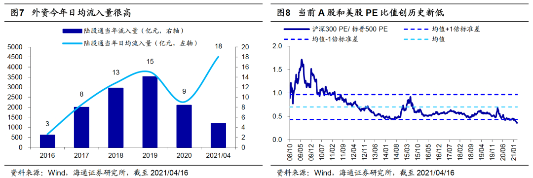 今年外资流入比往年都快。过去两年多,由于以基金为代表的内资大幅流入股市,投资者对外资的关注度不像之前的那么高了。但是2月18日以来茅指数接连下跌,由于茅指数中的个股也是外资偏好的个股,有投资者担忧外资会不会流出,茅指数会不会还没跌完。从陆股通北上资金的高频数据来看,2月18日至今(截至2021/04/16)北上资金还是净流入的,共流入了450亿元,如果从年初开始算,今年北上资金已经净流入了1200亿元,且日均流量高达18亿,创历史新高,可见今年外资流入速度很快。从14年底陆股通开通以来,过去六年(15-20年)我们估测包含Q/RQFII和陆股通北上资金在内的外资每年流入A股的规模分别是800、1000、2300、3300、3800和2300亿元,其中2020年外资流入规模放缓主要是因为MSCI等指数公司在18/19年大幅提升A股在其指数体系的纳入因子,使得被动型外资大幅流入,而20年指数公司没有进一步提升A估权重的计划。