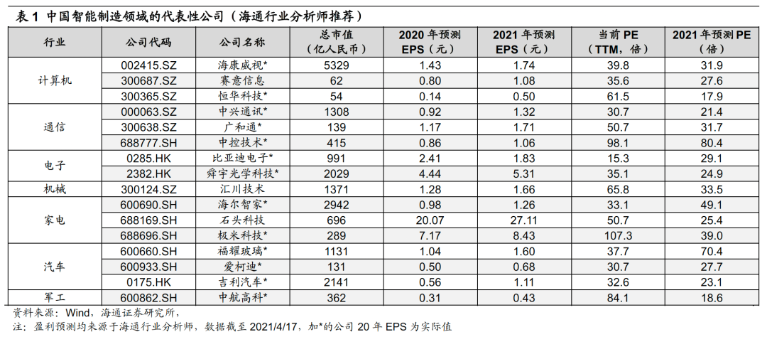 具体而言,沿着“中国智能制造”的主线,我们结合行业分析师认为有三个方向挖掘投资机会:(1)信息技术的应用。5G、人工智能、云计算等信息技术的颠覆式创新为中国智能制造打下基石,先进科技融合到制造产业能够极大地提高生产力,促进产品的创新升级,例如人工智能让大规模产品定制成为现实,从而使得制造向服务转型。根据海通行业分析师的推荐,我们建议重点关注计算机行业的海康威视、赛意信息、恒华科技;通信行业的中兴通讯、广和通、中控技术;电子行业的比亚迪电子、舜宇光学科技。(2)新能源技术的应用。我国光伏技术已经发展较为成熟,处于世界领先水平,同时动力电池技术的不断进步促进我国智能汽车制造蓬勃发展,建议重点关注汽车行业的福耀玻璃、爱柯迪、吉利汽车。(3)传统制造技术改进与升级。在科技进步的支撑下传统制造实现技术改进与升级,从机械化、电气化、自动化到数字化、智能化,例如工业机器人的大规模应用能够帮助制造业提质增效。我们建议重点关注机械行业的汇川技术,此外,建议关注国盛智科、永创智能;家电行业的海尔智家、石头科技、极米科技;军工行业的中航高科,此外,建议关注湘电股份、睿创微纳。