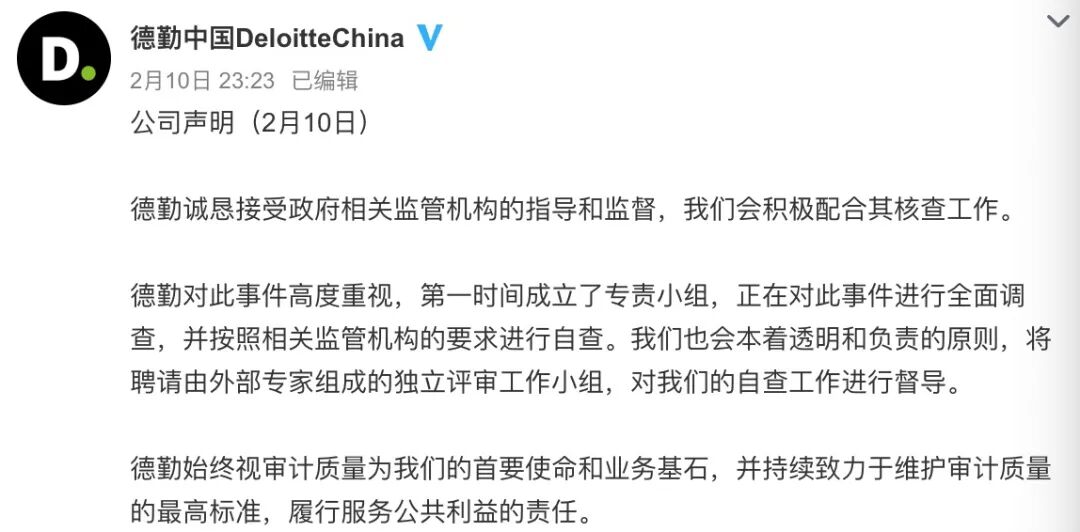 德勤当天夜间回应称,会积极配合其核查工作。第一时间成立了专责小组,正在对此事件进行全面调查,并按照相关监管机构的要求进行自查。