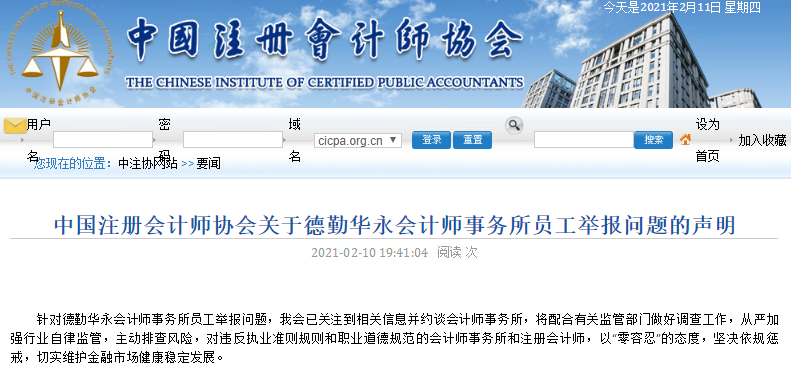 2月10日,财政部公开表示,高度重视德勤华永会计师事务所员工举报问题,第一时间约谈该所主要负责人,并要求该所进行认真自查。