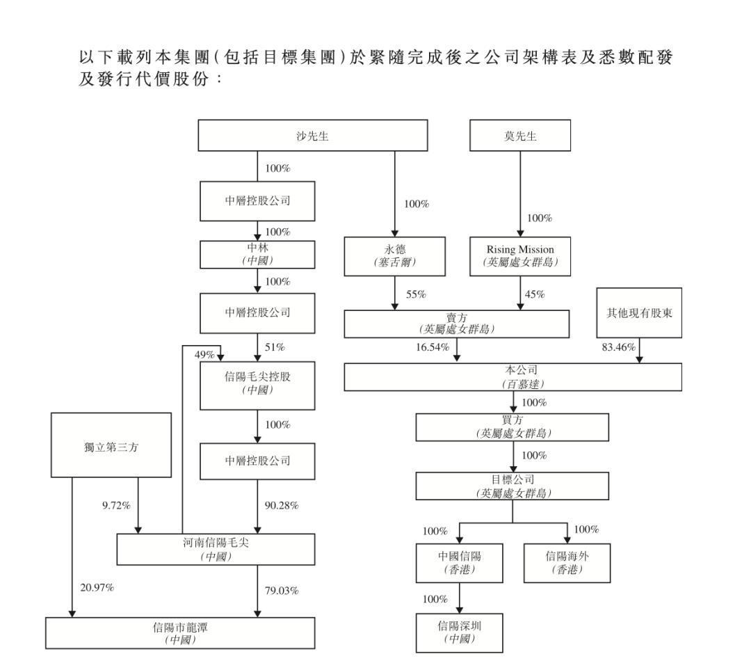 在中国天化工收购完成后,信阳毛尖国际控股实际控制人沙涛成为中国天化工的执行董事。其持有55%股权的Dragon Wise Group Limited,成中国天化工主要股东,并拥有中国天化工已发行股本约16.54%。