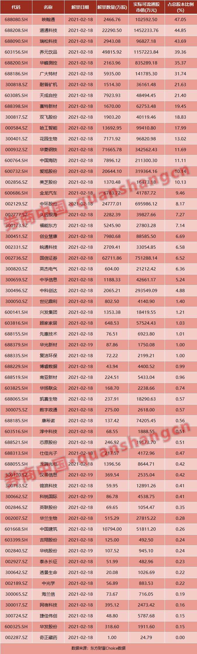 数据显示,本周(2月18日—2月19日)共有58家公司限售股陆续解禁,合计解禁量35.66亿股,按2月10日收盘价计算,解禁市值为744.26亿元。