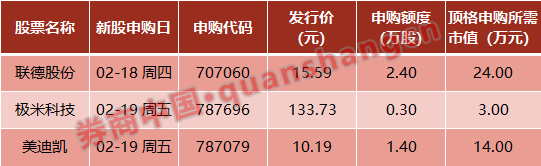本周四(2月18日)申购的是联德股份(申购代码:707060);本周五(2月19日)申购的是极米科技(申购代码:787696)、美迪凯(申购代码:787079)。