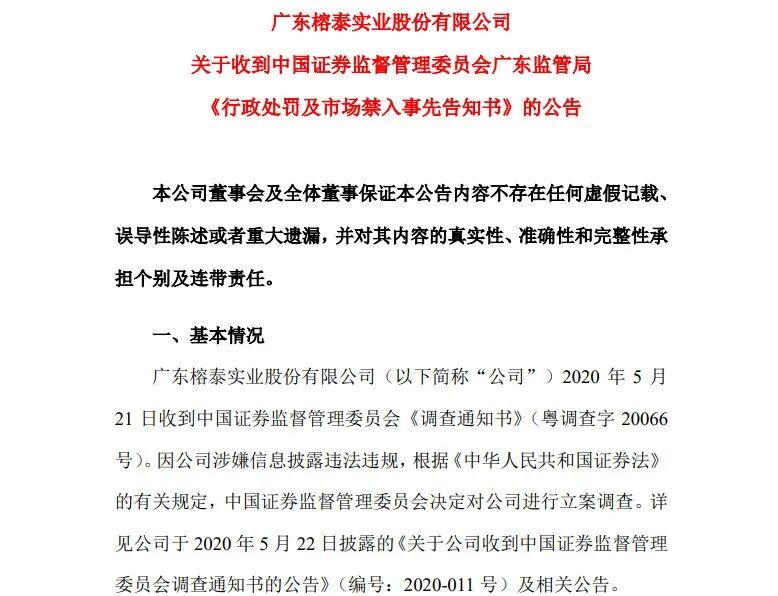 据广东榕泰3月12日披露的《行政处罚及市场禁入事先告知书》,调查结果显示,该公司涉嫌违法的事项包括未在规定期限内披露2019年年度报告,相关报告未按规定披露关联关系、日常经营性关联交易,2018年年度报告、2019年年度报告虚增利润等违法事实。
