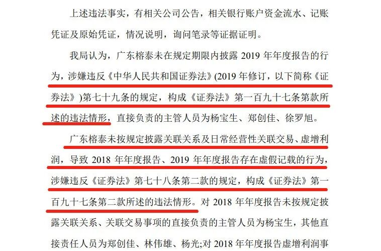 由此,广东证监局认为,广东榕泰未在规定期限内披露2019年年度报告的行为,涉嫌违反《中华人民共和国证券法》(2019年修订,简称《证券法》)第七十九条的规定,构成《证券法》第一百九十七条所述的违法情形。