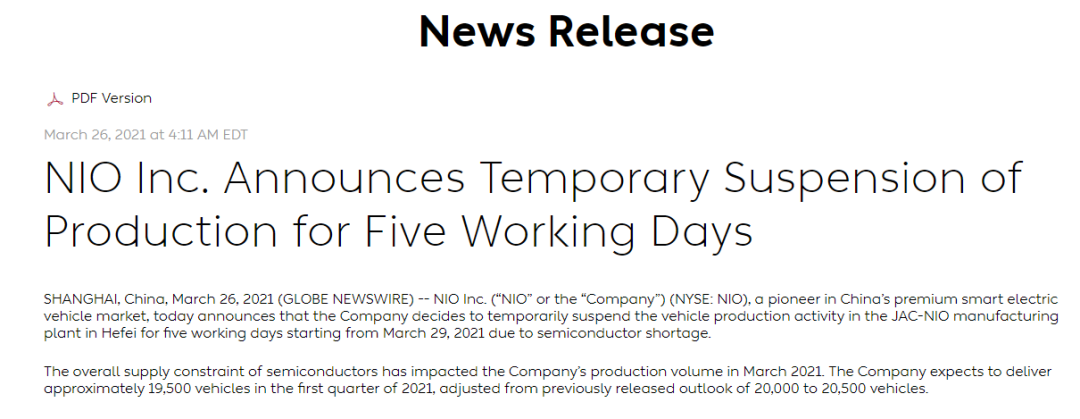 3月26日下午,造车新势力蔚来汽车宣布,由于半导体短缺,公司决定从3月29日起临时停产5个工作日。受此消息影响,蔚来汽车美股一度跌超8%。在此之前,福特、通用、本田、大众等车企均因芯片问题被迫减产。