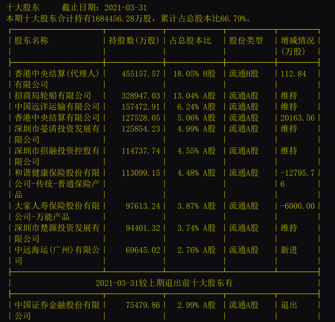 根据招商银行一季度报,期末十大股东持仓环比有了一定变化。其中,和谐健康-传统-普通保险账户,减持1.28亿股股份,一季度末持股数量降至11.3亿股,持股比例降至4.48%。其股东排位,也从去年四季度末的第四位,下降到了第七位。