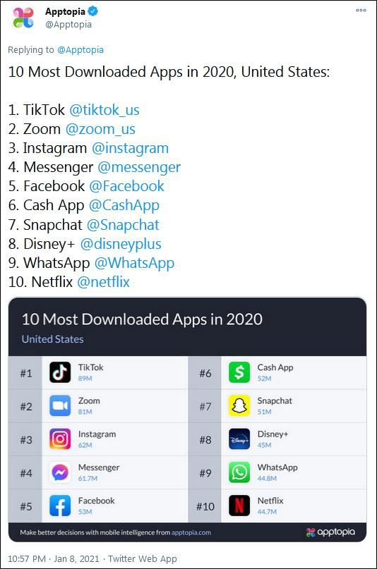 2021年1月份,数据分析公司Apptopia公布的数据显示,2020年美国手机应用程序排行榜上,TikTok下载量位居榜首。
