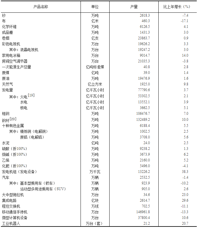 全年规模以上工业中,农副食品加工业增加值比上年下降1.5%,纺织业增长0.7%,化学原料和化学制品制造业增长3.4%,非金属矿物制品业增长2.8%,黑色金属冶炼和压延加工业增长6.7%,通用设备制造业增长5.1%,专用设备制造业增长6.3%,汽车制造业增长6.6%,电气机械和器材制造业增长8.9%,计算机、通信和其他电子设备制造业增长7.7%,电力、热力生产和供应业增长1.9%。