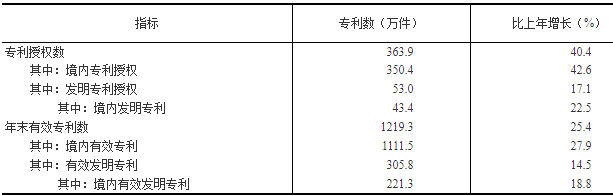 全年研究与试验发展(R&D)经费支出24426亿元,比上年增长10.3%,与国内生产总值之比为2.40%,其中基础研究经费1504亿元。国家科技重大专项共安排198个项目(课题),国家自然科学基金共资助4.57万个项目。截至年末,正在运行的国家重点实验室522个,国家工程研究中心(国家工程实验室)350个,国家企业技术中心1636家,大众创业万众创新示范基地212家。国家级科技企业孵化器1173家,国家备案众创空间2386家。全年授予专利权363.9万件,比上年增长40.4%;PCT专利申请受理量7.2万件。截至年末,有效专利1219.3万件,其中境内有效发明专利221.3万件,预计每万人口发明专利拥有量15.8件。全年商标注册576.1万件,比上年下降10.1%。全年共签订技术合同55万项,技术合同成交金额28252亿元,比上年增长26.1%。