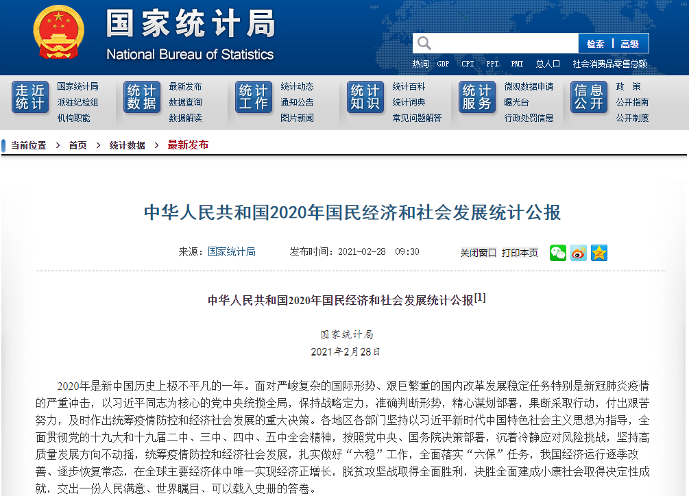 国家统计局官方网站2月28日发布《中华人民共和国2020年国民经济和社会发展统计公报》。