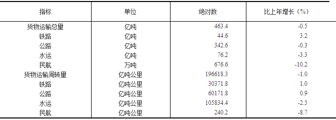 全年货物运输总量463亿吨,货物运输周转量196618亿吨公里。全年港口完成货物吞吐量145亿吨,比上年增长4.3%,其中外贸货物吞吐量45亿吨,增长4.0%。港口集装箱吞吐量26430万标准箱,增长1.2%。