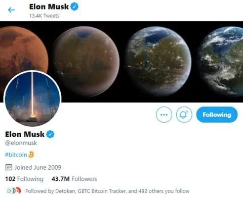 1月29日,马斯克将自己的推特简介改为“Bitcoin”,一小时内,比特币价格大涨18%。