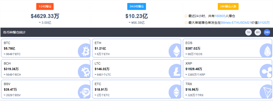 比特币价格的剧烈波动,也导致加密货币市场爆仓金额猛增,据比特币家园统计,近24个小时内,有18万人爆仓,爆仓金额超66亿元。其中,最大一笔爆仓单发生在Bitmex-ETHM21价值1120万元。