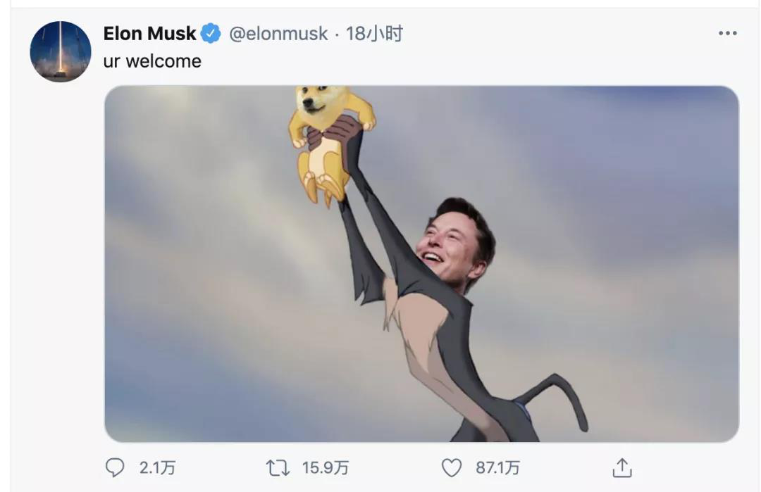 2月4日,马斯克突然发推“Doge”,狗狗币涨幅迅速攀升50%。过了一会儿,马斯克又发推自夸称“不用谢”,同时转发了一条网友制作的恶搞图片:马斯克化身电影狮子王里的狒狒长老,高高举起“狗狗币”。