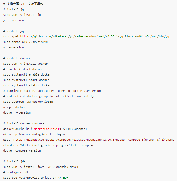 在EC2上执行以下脚本,安装并配置jq,yq,docker,jdk,kafka-console-client五个必须的软件包,可以根据自身EC2的情况酌情选择安装全部或部分软件。建议使用纯净的EC2实例,完成全部的软件安装:
