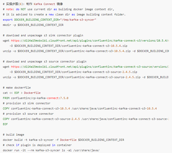 接下来是制作带S3 Sink Connector和S3 Source Connector的Kafka Connect镜像,镜像和容器均以kafka-s3-syncer命名,以下是具体操作: