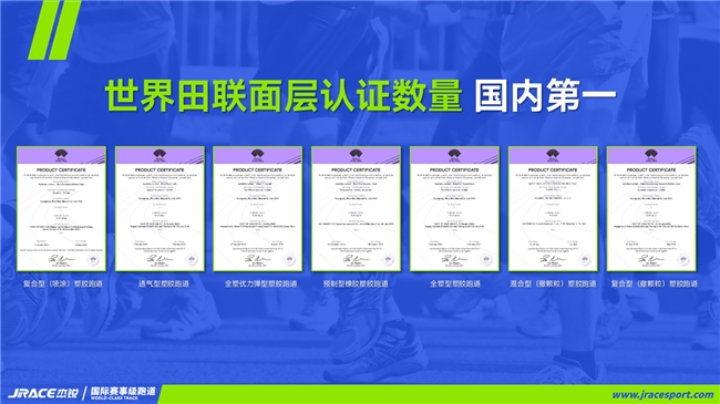 凭借深厚的技术积淀与过硬的产品品质,JRACE杰锐体育已将目光投向更广阔的世界舞台,成功实现与国际标准接轨。目前,企业已拥有7款世界田联WA认证跑道面层,认证数量位居国内首位,具备服务国际顶级赛事的专业能力,这不仅是JRACE杰锐体育自身实力的彰显,更标志着中国运动地材行业在产品标准化、品质高端化方面取得了重要突破,为中国运动地材走向世界奠定了坚实基础。